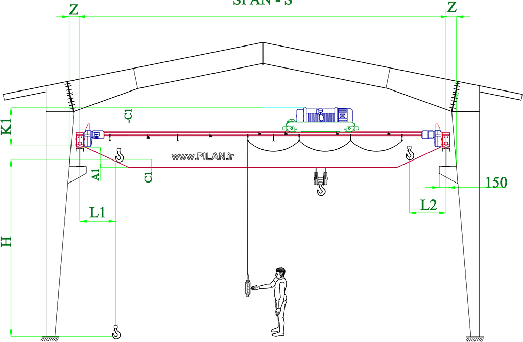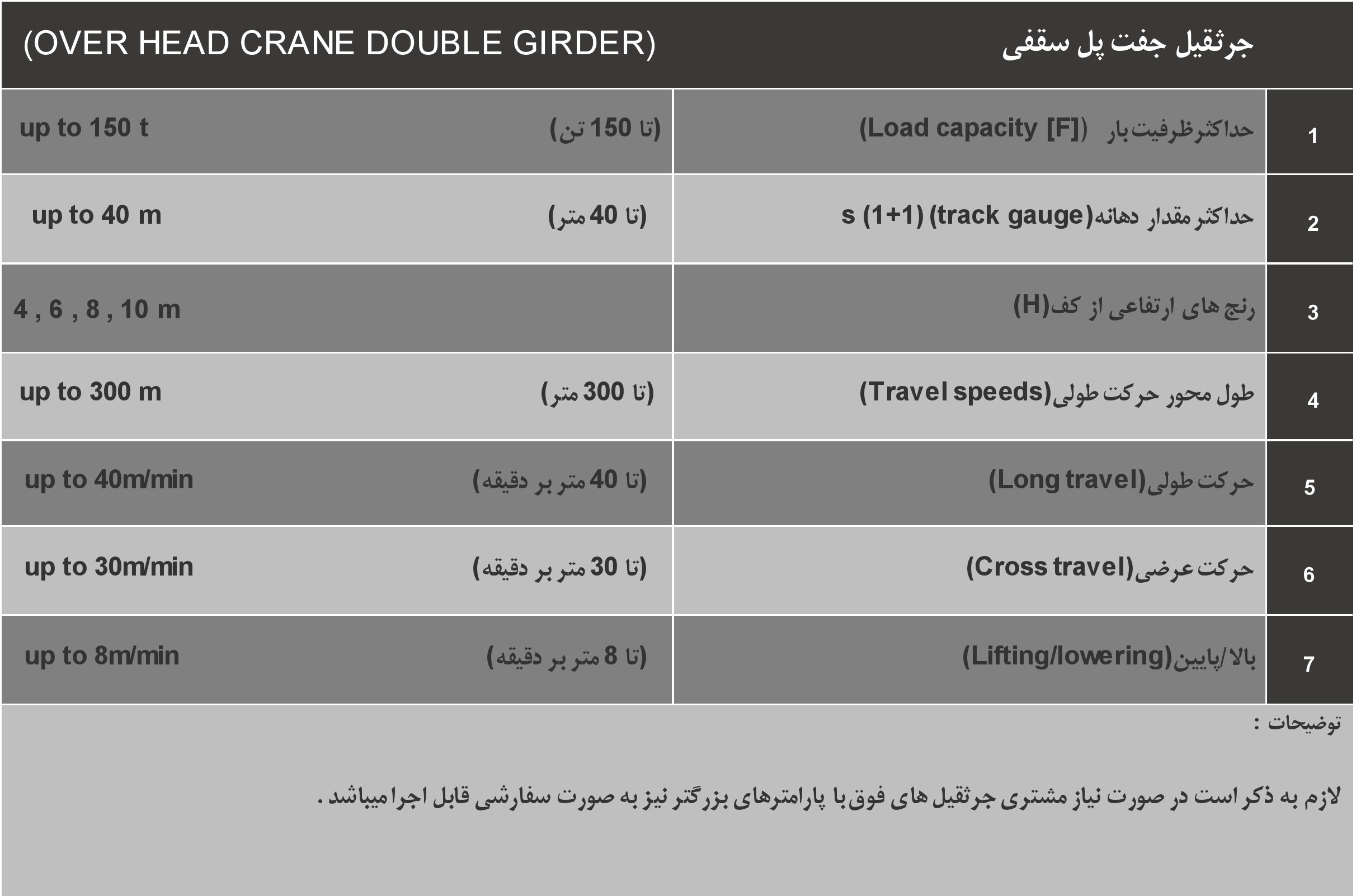 يک جرثقيل جفت پل در راستاي طول سوله و بر روي مسير مرتفعي حرکت کرده و براي قلاب، سه محور حرکتي X, Y, Z ايجاد مي کند. بالابر، بار را به سمت بالا و پايين، کالسکه بار را به سمت چپ و راست و پل جرثقيل بار را به سمت جلو و عقب به حرکت در مي آورد