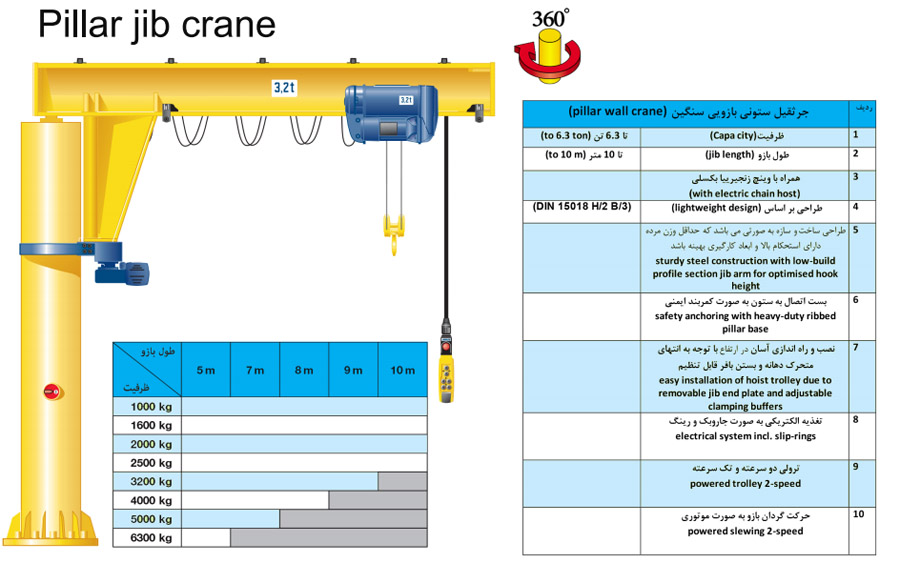 جرثقیــل های ستونی بازویی پیلان براساس این واقعیت طراحی شده اند که بتوانند عملا در هر جایی قابل نصب باشند. آنها به صورت کاملا مستقل بر روی ستون خود قرار می گیرند و به عنوان جرثقیل های کارگاه، انبار سازی و برای رمپ های بارگیری استفاده می شوند. علاوه بر این همانند تمامی جرثقیل های مدل بازویی جرثقیل های ستونی بازویی دارای ظرفیت بالای بارگیری و دسترسی بالایی می باشند. تنها فضای مورد نیاز فضایی برای نصب یک ستون می باشد. می توان آن را به وسیله پیچ و مهره محکم کرد، و یا با کمک صفحات میانی و انکر بولت نیز به هم متصل ساخت.