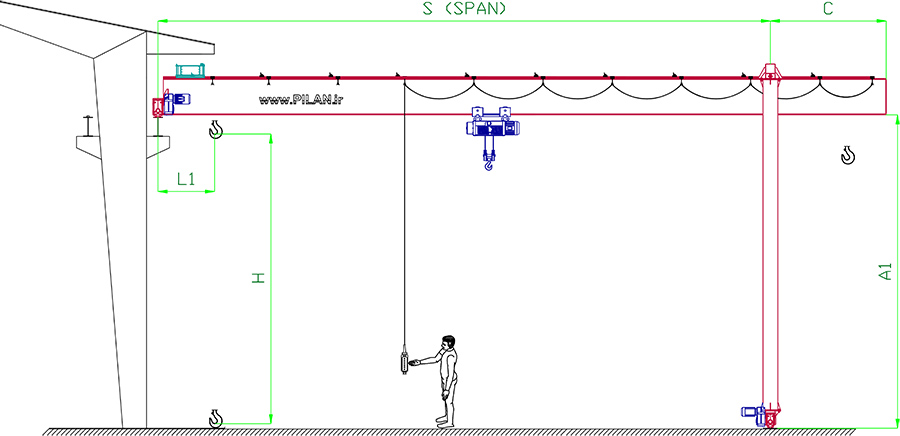 پلان جا نمایی از روبرو( جرثقیل نیم دروازه ای ):