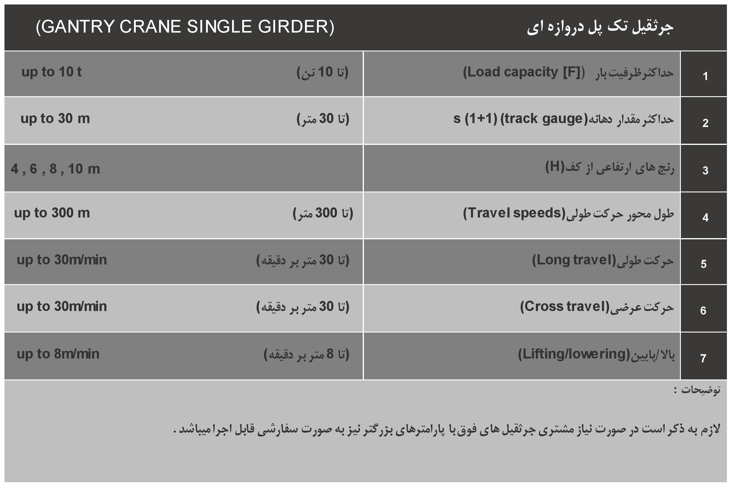 لذا جرثقيــــلهاي دروازه اي و نيم دروازه اي که توسط اين شرکت طراحي وساخته مي شوند جزو آخرين ورژن هاي جهاني بوده و داراي ويژه گي هاي برجسته اي به شرح ذيل مي باشد: